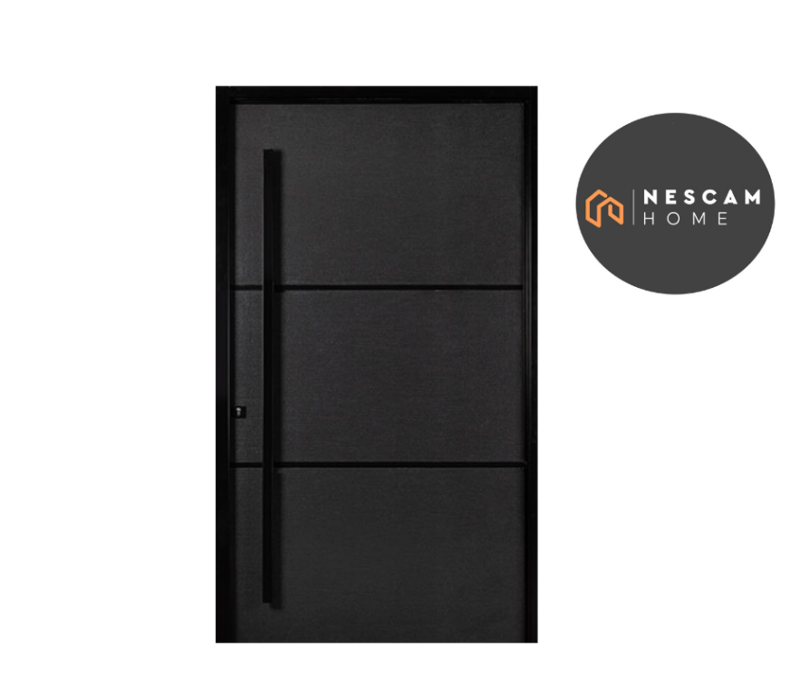 Es una puerta pivotante de acero, lista para instalar, con un sistema propio de ajuste de la altura de la hoja. Libre de mantenimiento. Hoja con apliques de acero negro mate, tapacanto de aluminio negro.