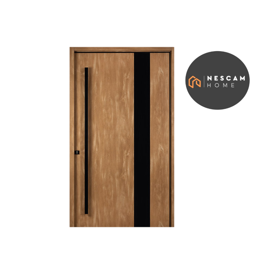Es una puerta pivotante de acero, lista para instalar, con un sistema propio de ajuste de la altura de la hoja. Libre de mantenimiento. Hoja con aplique de acero negro mate, tapacanto de aluminio negro.