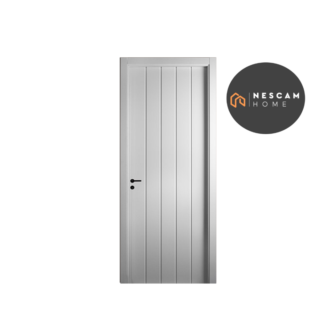 Caras con listones anchos de MDF de 12 mm, foliada con papel melamínico en color blanco. Cerradura Kallay 4006. Burlete perimetral. Tratamiento en la parte inferior de la hoja. Puerta de abrir en: 2,00 m, 2,20 m y 2,40 m.